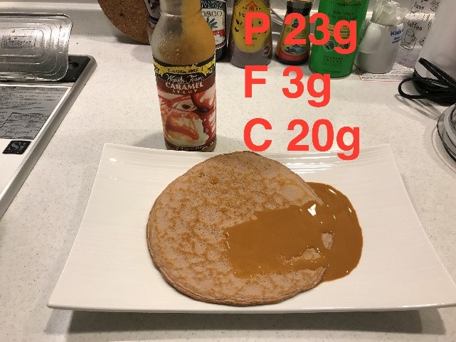 パンケーキ1枚のマクロ栄養素は、P(タンパク質)23g、F(脂質)3g、C(炭水化物)20gになりますので、トレーニングやダイエットをしている人には良いかと思います。