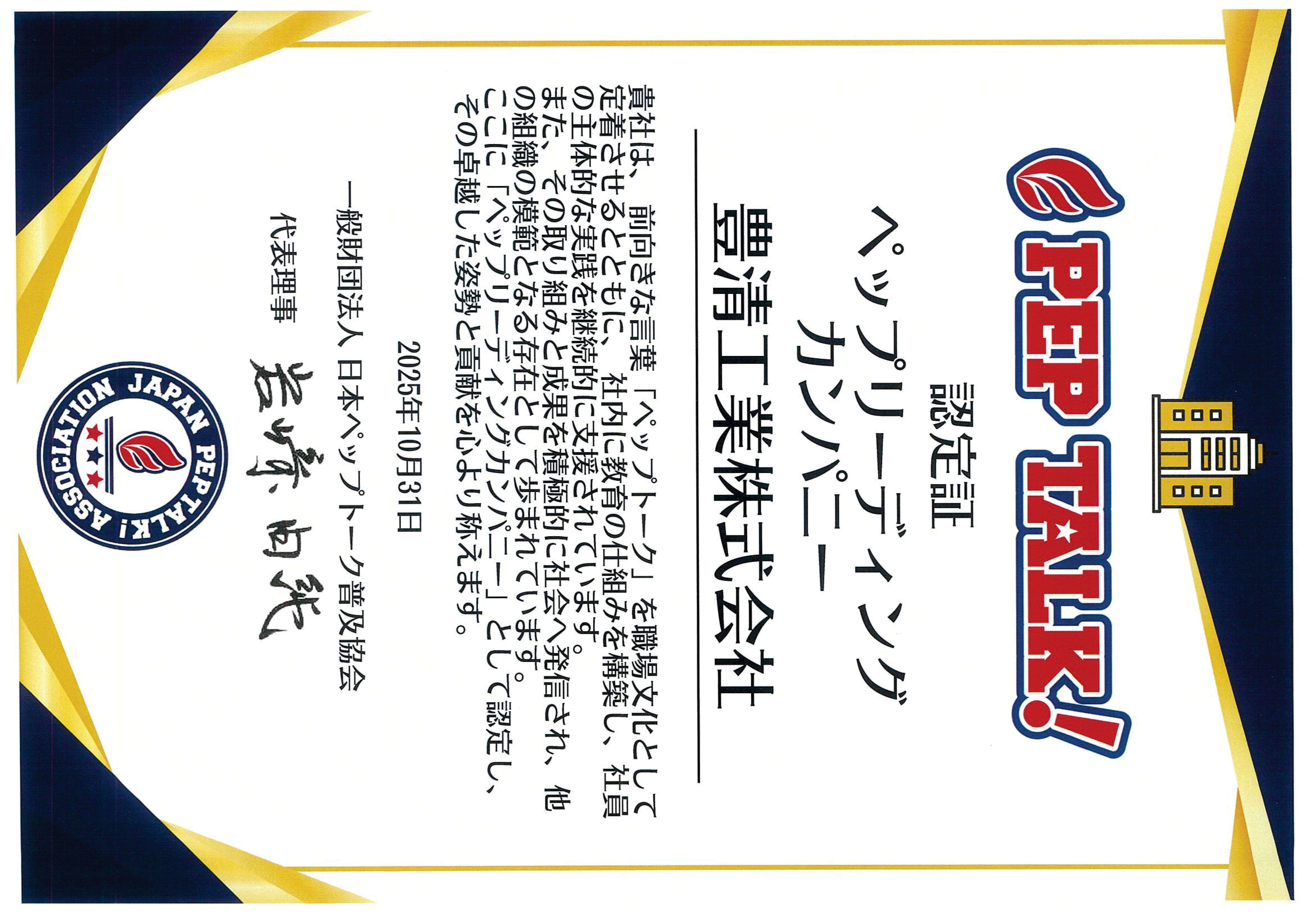 日本ペップトーク普及協会より、記念すべき初代「ペップリーディングカンパニー」認定企業として選ばれました。