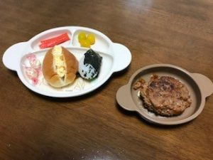 こちらの写真は別の日に作ったハンバーグと慣れないことをして疲れて手を抜いたおかずたちです。この日は手抜きおかずを半分ほど食べて、ハンバーグは食べてくれませんでした。