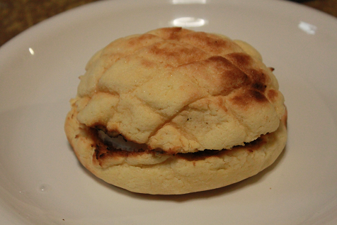 買ってきたメロンパンを半分に切って、トースターで焼き、アイスを挟みました。