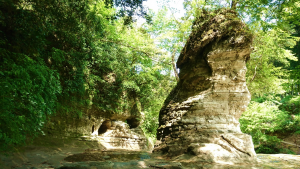 濃溝の滝は、清水渓流広場内にある亀岩の洞窟に流れる滝?です。もともとは滝よりも洞窟がメインなのですが、SNSに投稿された画像がジブリっぽくて神秘的だと話題になったそうです。