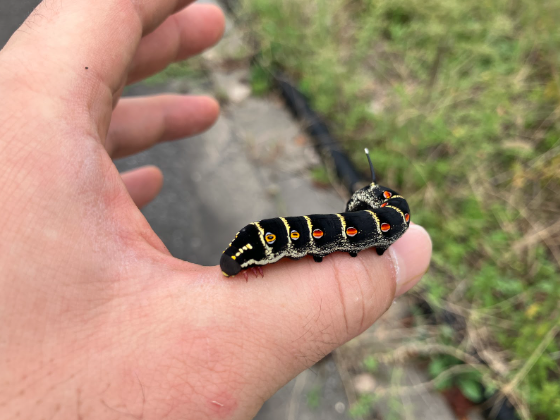 関係ないですが、先々月セスジスズメガの幼虫が頑張って道を横断していたので捕まえました。
