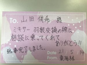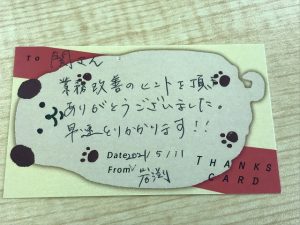 試験課の東海林さんからもらったサンクスカードです。